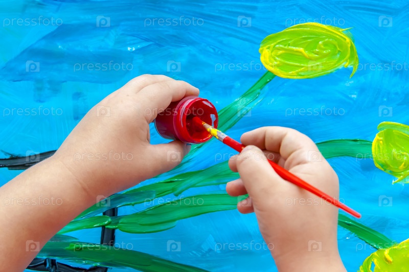 Ребенок рисует яркую картинку. Большие мазки краски на бумаге
