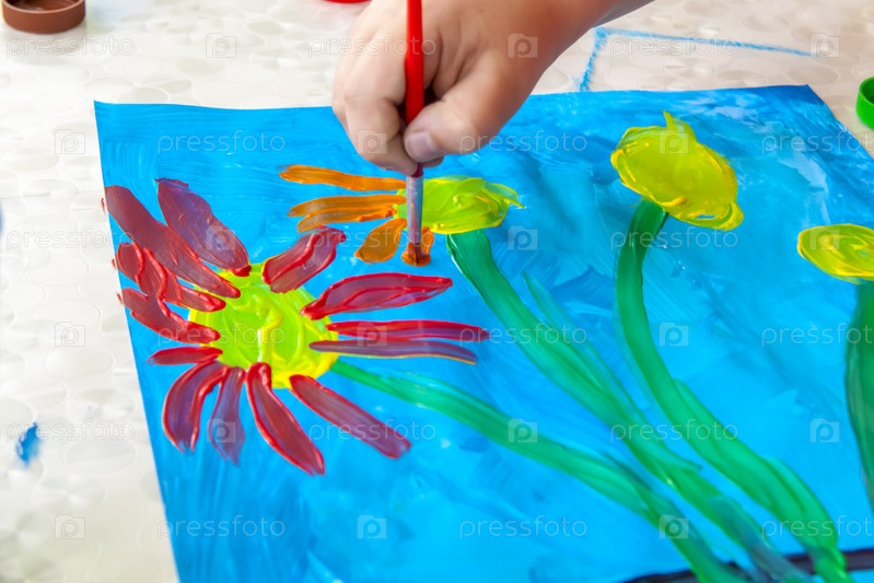 Ребенок рисует яркую картинку. Большие мазки краски на бумаге