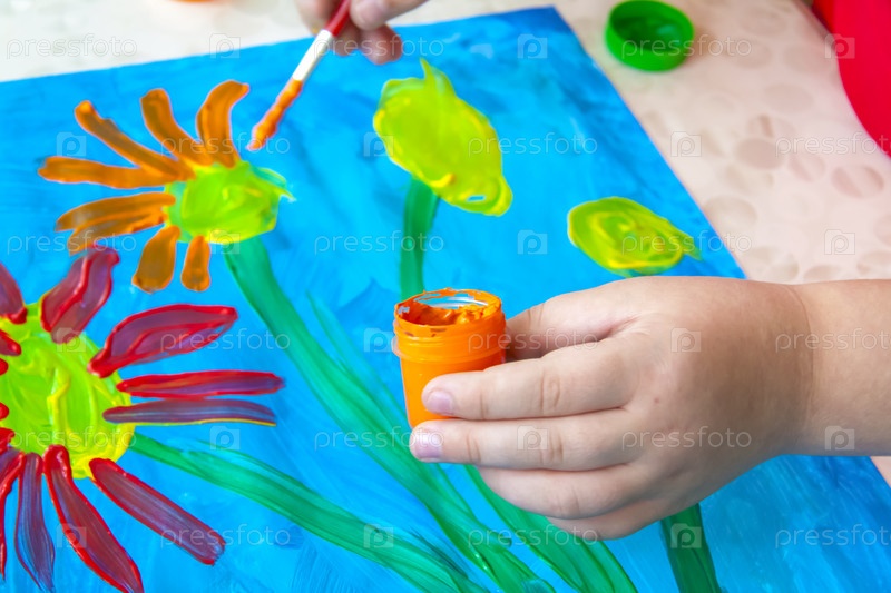 Ребенок рисует яркую картинку. Большие мазки краски на бумаге
