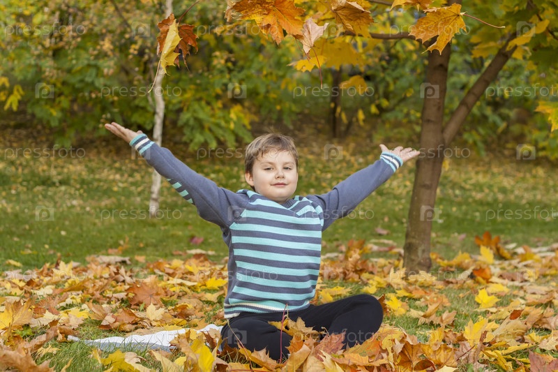 Дети играют в осеннем парке. Дети бросают желтые листья. Мальчик с кленовым листом. Осенняя листва