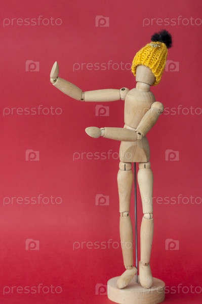 Деревянный манекен мужчины в вязаной желтой шапке указывает на место рядом с ним. Манекен мужчины из дерева на красном фоне