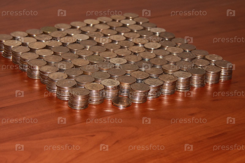 Москва, 15.10.2012, На столе аккуратными стопками лежат пятирублевые монеты