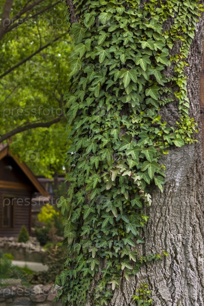 Большое дерево в парке обвито вьющимся растением. Красивый зеленый фон