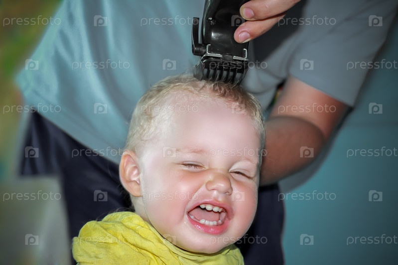 Первая стрижка на голове маленького мальчика в его жизни. Мужчина — это отец, который стрижет сына. Сбрейте локоны с головы ребенка электробритвой