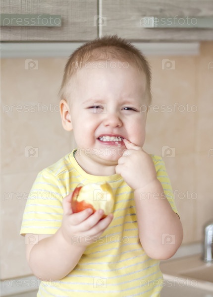 Мальчик сидит на кухонном столе, ест яблоко и очень сильно смеется