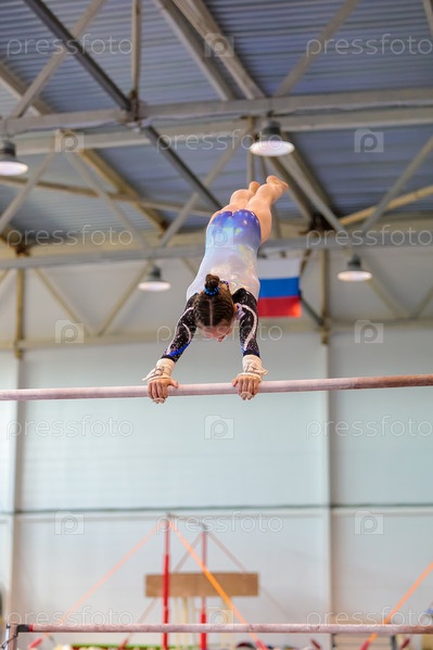 Молодая девушка в спортивной одежде выполняет упражнение на брусьях
