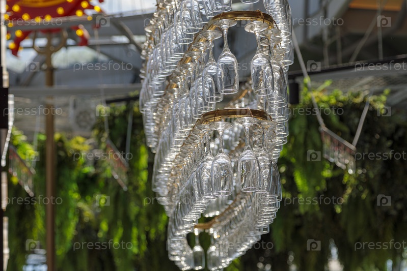 Несколько рядов бокалов для шампанского висят на прилавке в форме люстры