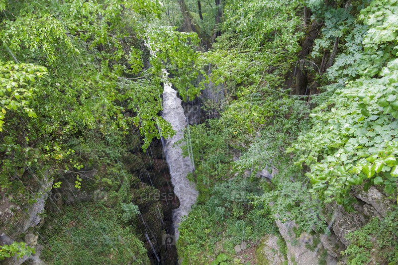Сильный ливень на бездне и реке среди гор Кавказа