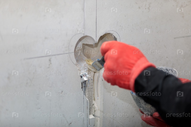 Электрик загрунтует отверстия и каналы для розеток и проводов
