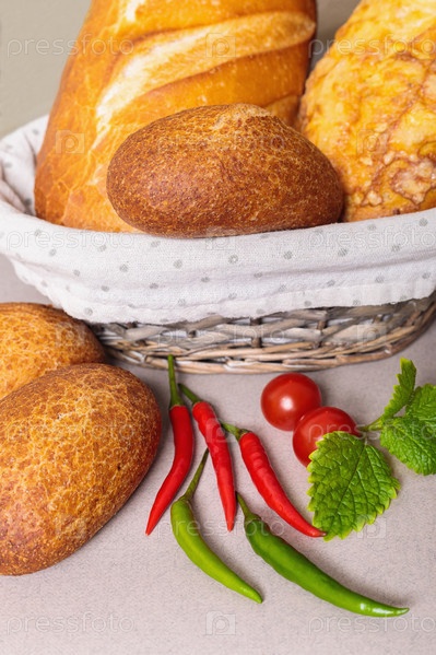 Свежий хлеб в корзине на столе с красным перцем и помидорами