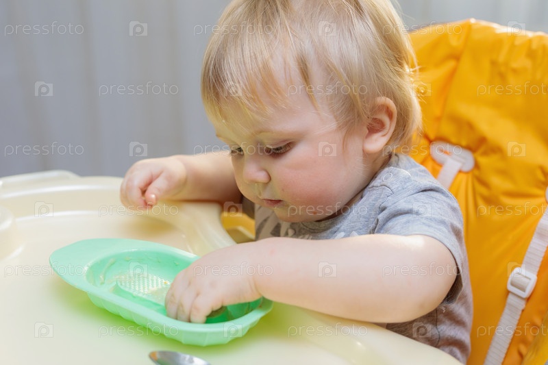 Маленький ребенок сидит на высоком стуле и ест ложкой