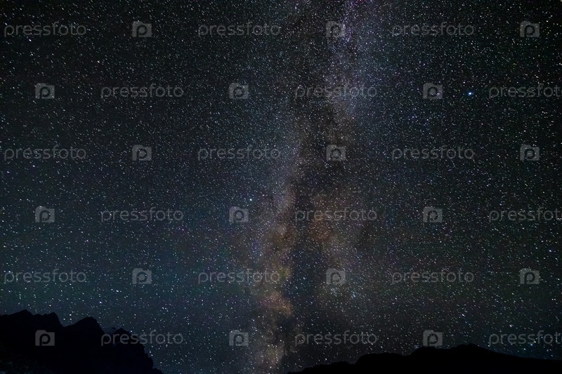 Звездное небо и млечный путь с яркими звездами над горами