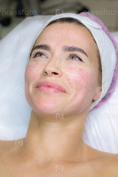 Молодой женщине вытирают следы крови от инъекции плазмы на лице