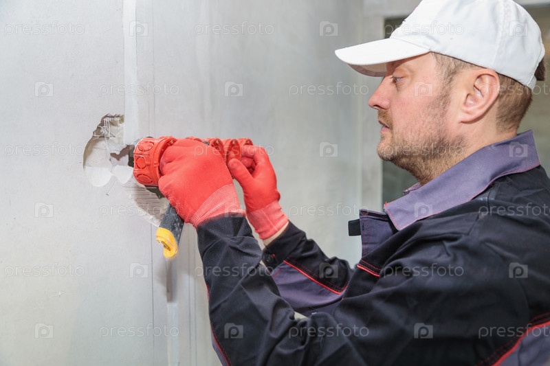 Электрик-мужчина вставляет в стену красные коробки для электрических розеток