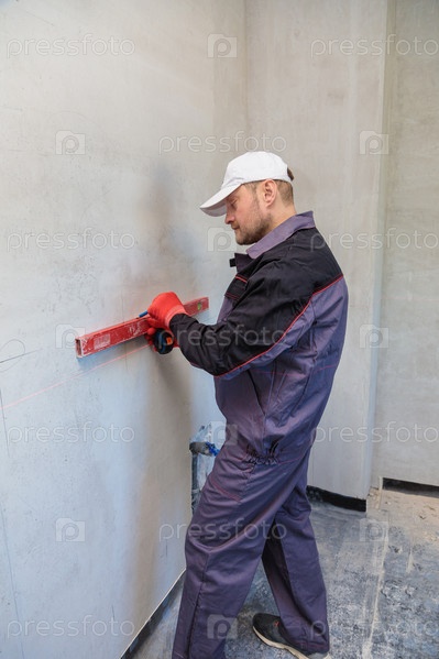 Мужчина, электрик отмечает отверстия для розеток карандашом, рулеткой