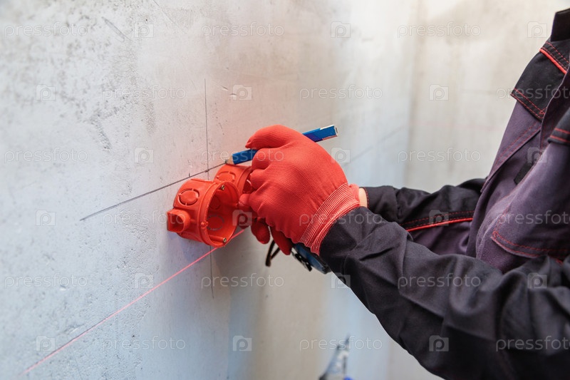 Мужчина, электрик отмечает отверстия для розеток карандашом, рулеткой