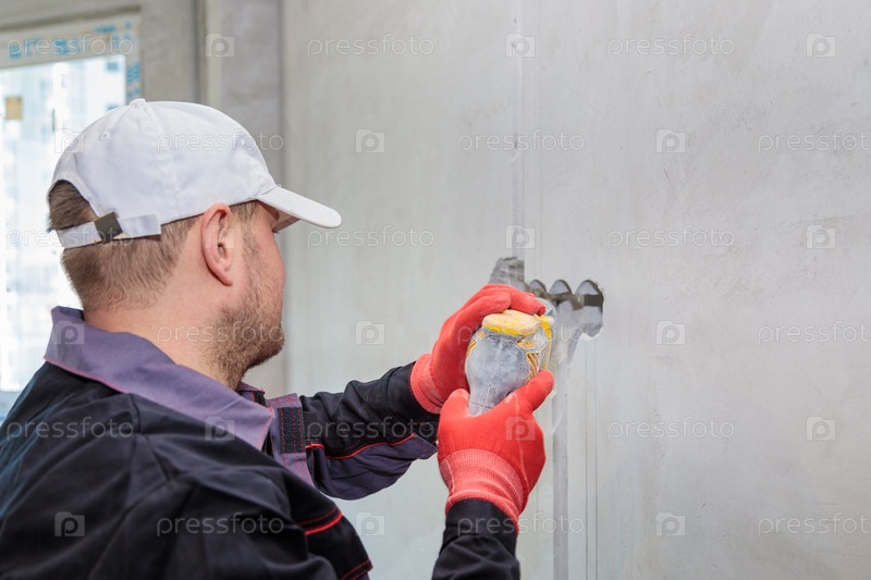 Электрик сверлит отверстия для розеток алмазной коронкой
