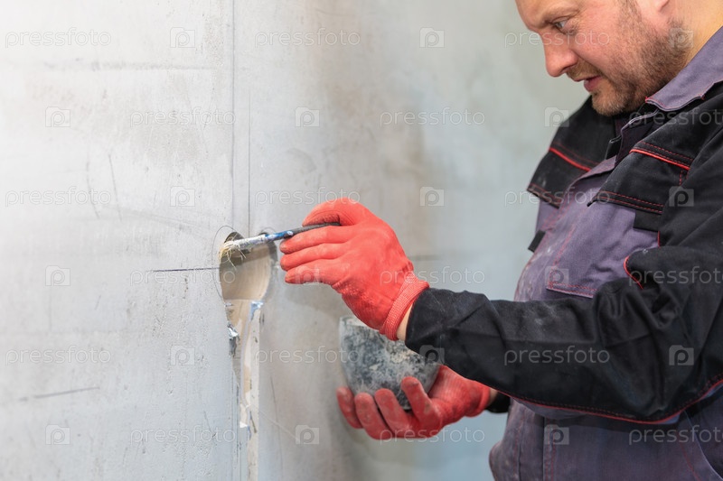 Электрик загрунтует отверстия и каналы для розеток и проводов