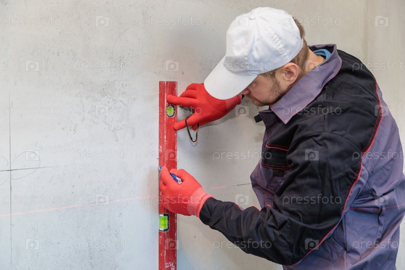 Мужчина, электрик отмечает отверстия для розеток карандашом, рулеткой