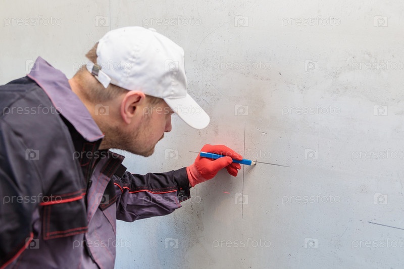 Мужчина, электрик отмечает отверстия для розеток карандашом, рулеткой