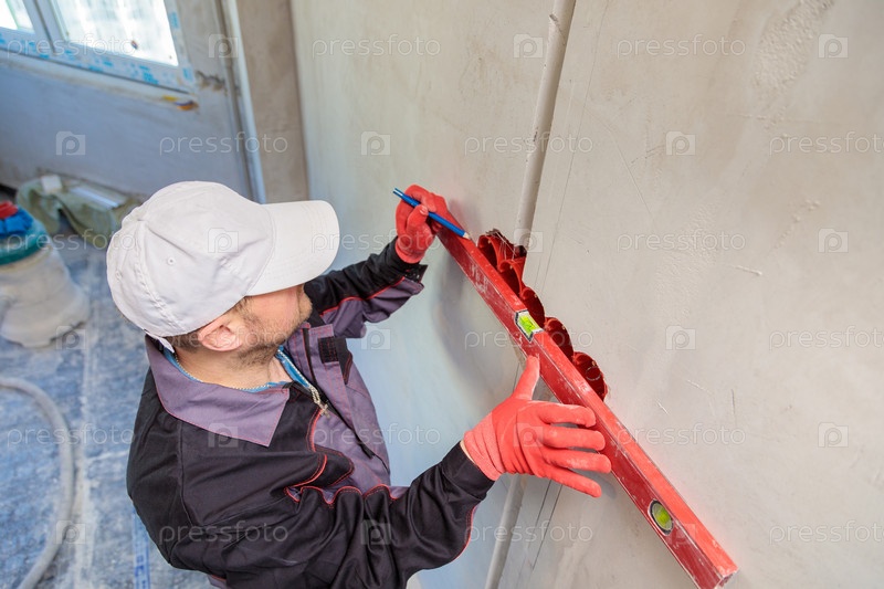 Электрик-мужчина проверяет розетки, встроенные в стену, строительным уровнем