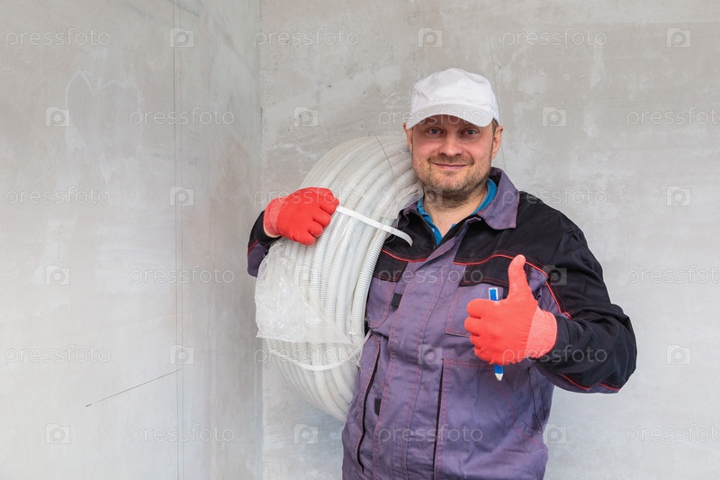 Электрик с катушкой гофрированного кабеля для розеток