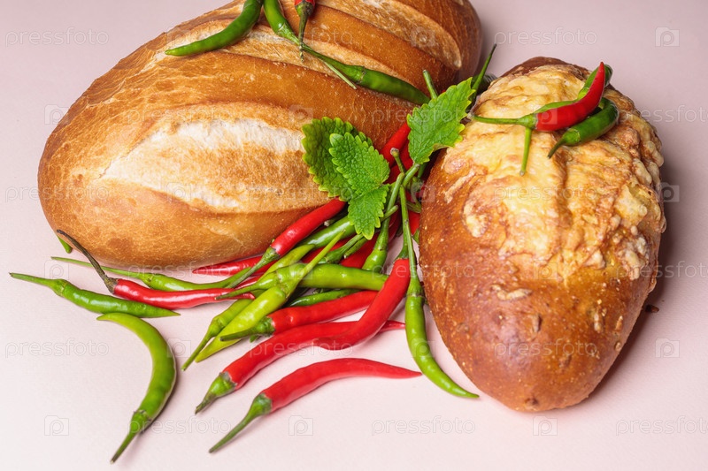Свежий хлеб на столе с красным и зеленым перцем чили