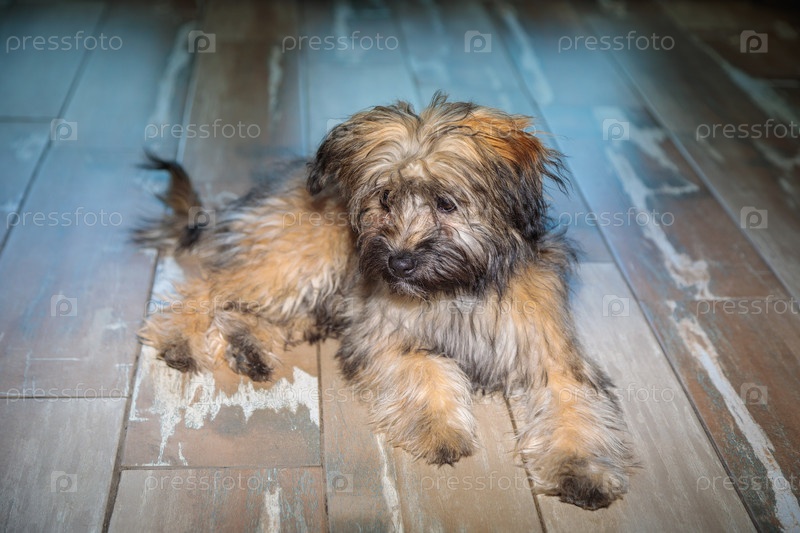 Маленький лохматый щенок лежит на полу после игры