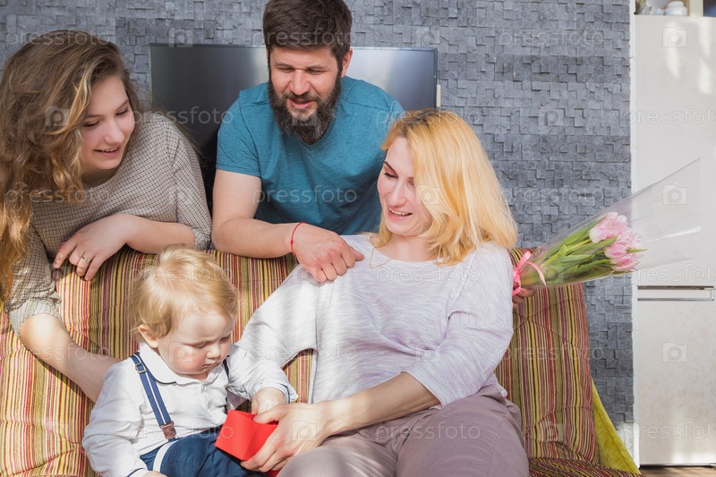 Папа с детьми поздравляют маму с праздником, днем матери