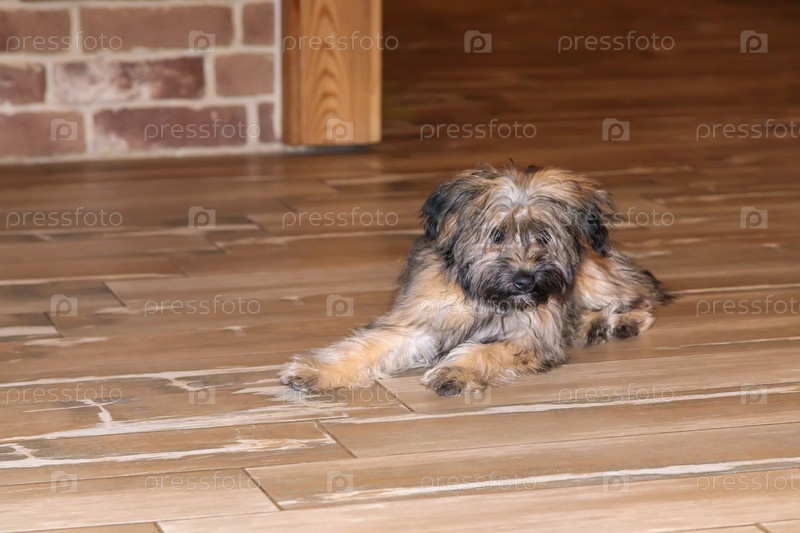 Маленький лохматый щенок лежит на полу после игры