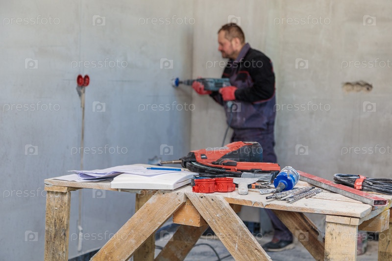 Электрик сверлит отверстия для розеток алмазной коронкой
