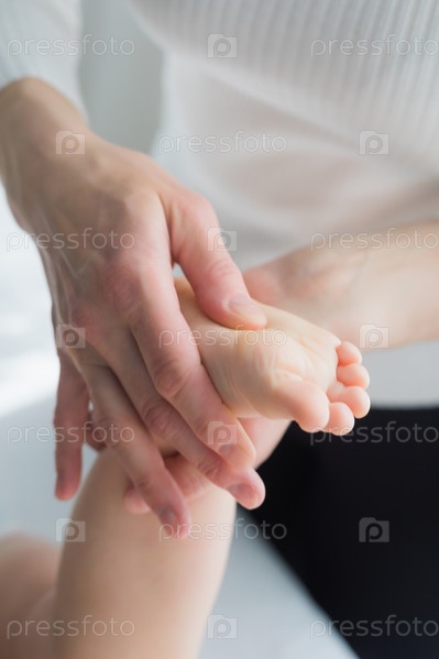 Мама делает ребенку массаж ног и ступней. Крупный план