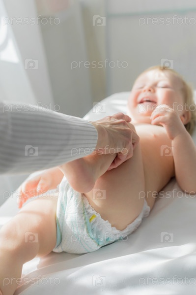 Мама делает детскую гимнастику для ножек малыша. Крупный план