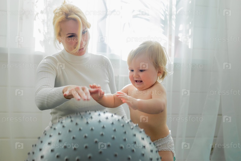 Мама занимается гимнастикой с малышом на надувном мяче