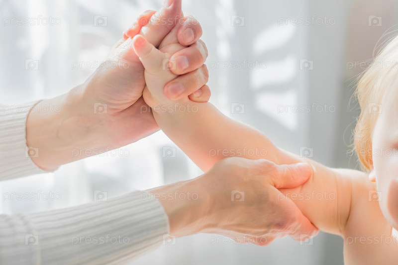 Мама делает ребенку массаж рук. Крупный план