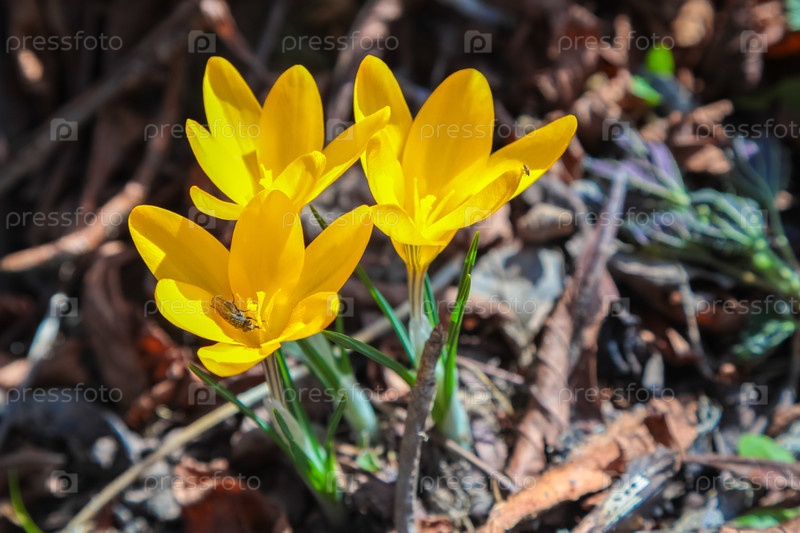 Ярко-желтые цветки крокуса после таяния снега на проталинах