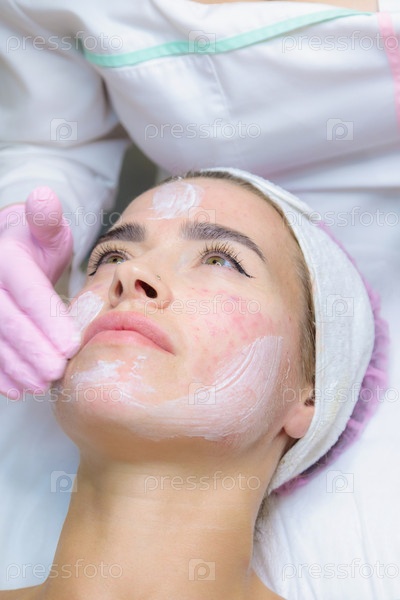 Молодой женщине вытирают следы крови от инъекции плазмы на лице