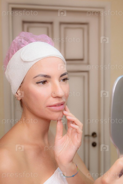 Молодая девушка смотрит на свое лицо в зеркале после массажа