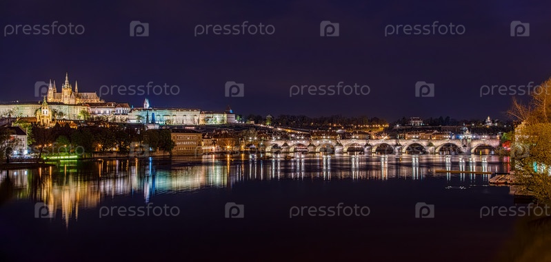 Карлов мост в Праге вечером с разноцветными огнями фонарей