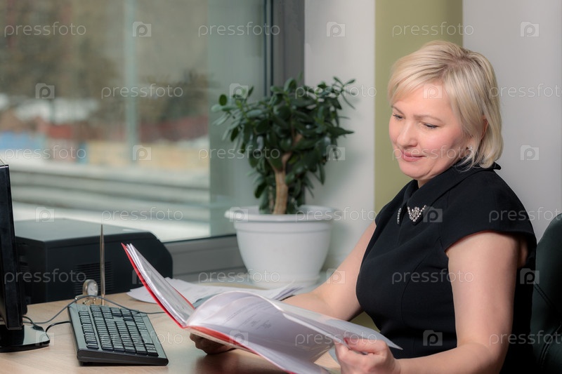 Женщина-директор, работающая в офисе, сидит за столом, анализирует бизнес-статистику, проверяет документы
