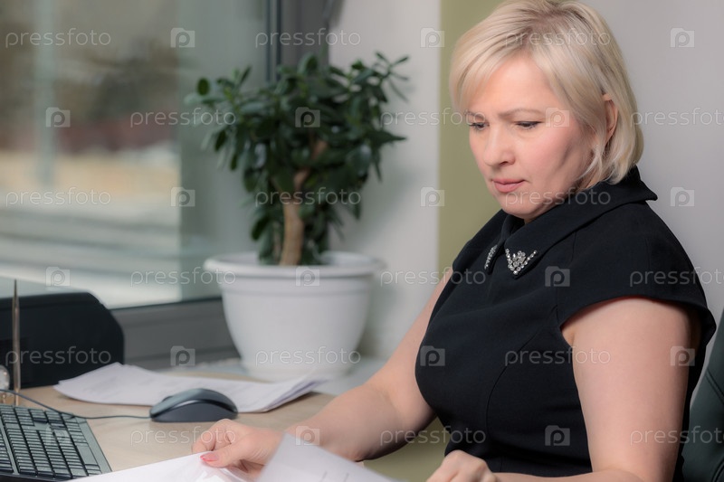 Женщина-директор, работающая в офисе, сидит за столом, анализирует бизнес-статистику, проверяет документы