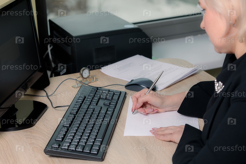 Женщина-директор, работающая в офисе, сидит за столом, анализирует бизнес-статистику, проверяет документы