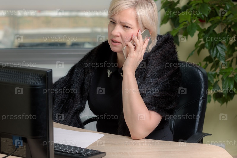 Женщина-директор, работающая в офисе, сидит за столом, разговаривает по телефону, проверяет документы