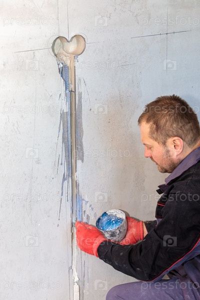 Электрик загрунтует отверстия и каналы для розеток и проводов