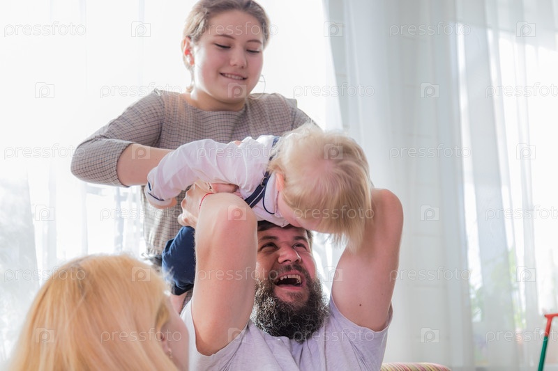 Папа и дочка играют с малышом, держа его на голове
