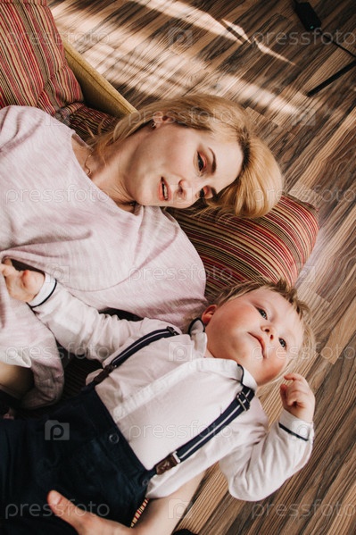 Мама лежит на диване и играет с малышом