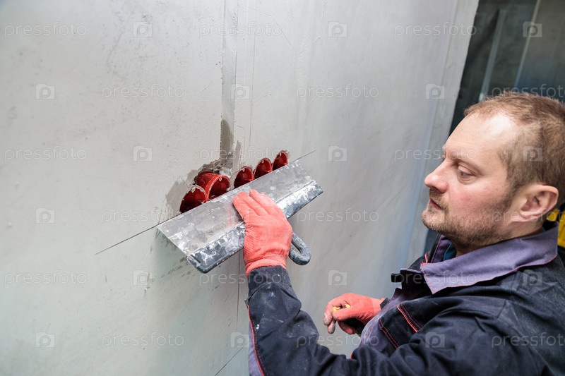 Электрик заштукатурит отверстия и каналы для розеток и проводов