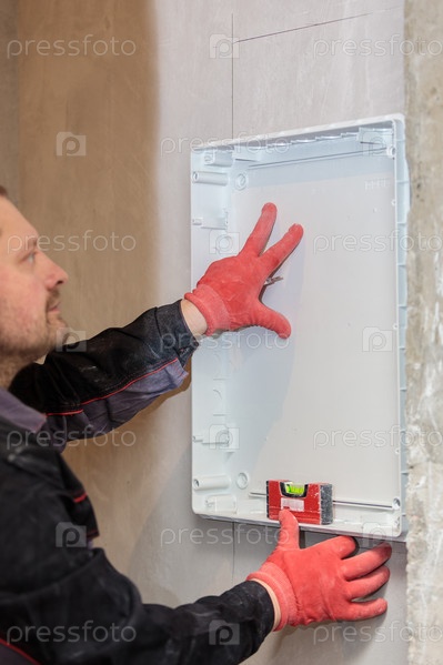 Электрик примеряет и отмечает линии электрощита