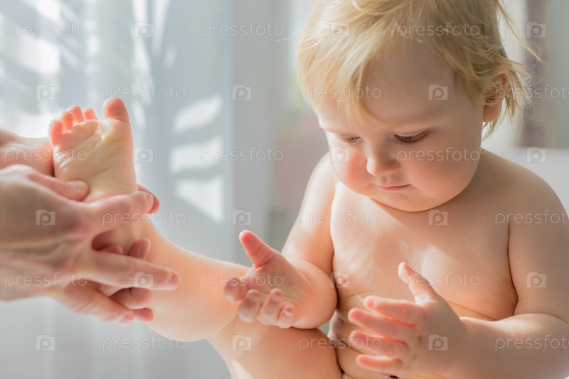 Мама делает ребенку массаж ног и ступней. Крупный план