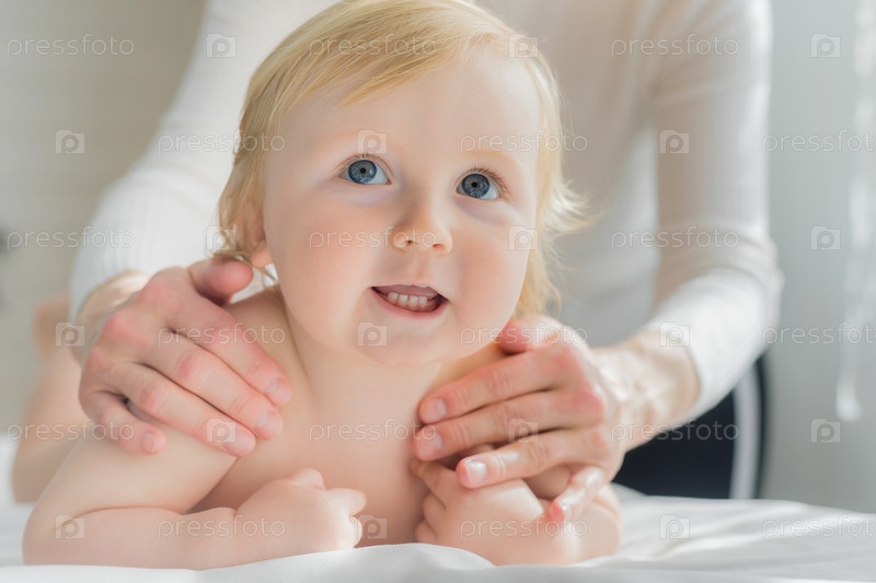 Мама делает ребенку массаж плеч и спины. Крупный план